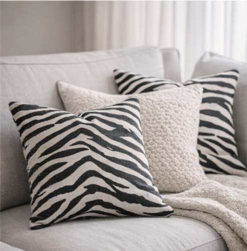 Animal prints are still hot on the fashion runways—and they can make a bold statement in your interiors too. A few zebra print pillows add unexpected energy and pattern to sofas, chairs, or even your bed, keeping things fresh and playful.